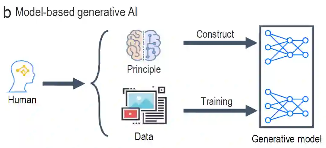 基于模型的生成式算法采用了不同的设计范式(见下图)。其基本流程为:首先依据统计学、物理学等相关理论构建生成模型,学习数据的内在分布规律,然后借助采样算法完成数据生成过程。在 20 世纪 80 年代,神经网络模型的理论体系已逐步走向成熟,在文本生成、语音生成等关键任务中取得了阶段性成功,为后续深度模型的发展奠定了坚实基础。