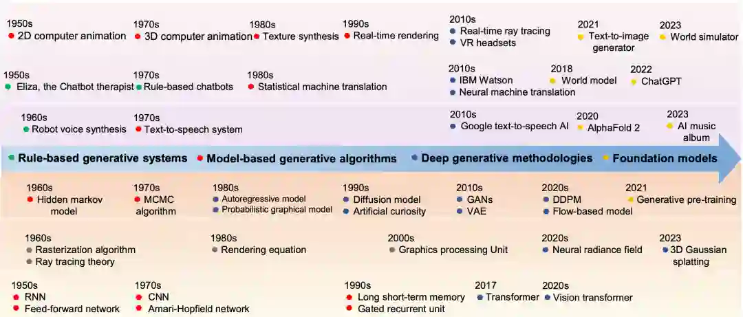 生成式人工智能是指能够生成文本、图片、声音、视频及代码等多样化内容的智能技术,近年来取得了显著进展。基于预训练大模型的智能生成技术已具备相当程度的实用性,而且展现出来生成和推理等关键能力,在多个领域的实际任务中发挥了关键作用,产生了深远的影响。近日,中国科学院自动化研究所赫然研究员等在《国家科学评论》(National Science Review, NSR)发表综述文章,梳理了生成式人工智能的发展脉络(见下图)。赫然为通讯作者,其他作者还包括自动化所曹杰副研究员,以及自动化所及南京大学谭铁牛院士。生成式人工智能的发展进程