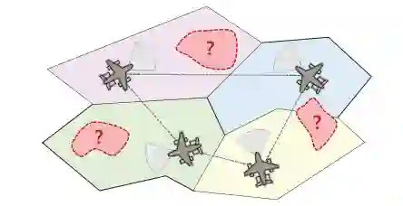图1 采用协同作战飞机执行分散式ISR任务的任务层面概念示意图。每架飞机在局部威胁不确定性下,在指定区域内执行监视。彩色多边形表示示例性区域划分,红色虚线区域标注不确定威胁位置,带有传感弧段的飞机图标示意传感覆盖范围。