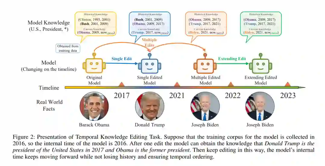 修订或更新大型语言模型中存储的知识的紧迫任务源自两个不同的来源:模型中固有的应该被纠正的内在错误和由于现实世界外部变化导致的过时知识应该被更新。在模型编辑方面的主要努力将这两类不同原因产生的编辑混为一谈,直接将模型中的原始知识修改为新知识。然而,我们认为保留模型的原始知识仍然是重要的。特别是,如果模型的知识因为世界动态的发展而过时,它应该在整合新发现的知识的同时保留对历史知识的记忆。在这项工作中,我们介绍了时序知识编辑(Temporal Knowledge Editing,TKE)的任务,并建立了一个评估当前模型编辑方法的基准——时序知识编辑评估(Assessment of TempOral Knowledge Editing,ATOKE)。我们发现,尽管现有的模型编辑方法在使模型记住新知识方面有效,但编辑过的模型却灾难性地忘记了历史知识。为了解决这一差距,我们提出了一个简单且通用的框架,名为时序目标多编辑(Multi-Editing with Time Objective,METO),用于增强现有的编辑模型,该框架同时编辑历史和新知识,并优化模型对每个事实时间的预测。我们的评估表明,虽然ATOKE仍然困难,但METO在学习新知识的有效性方面保持不变,同时显著提高了编辑模型在利用历史知识方面的性能。