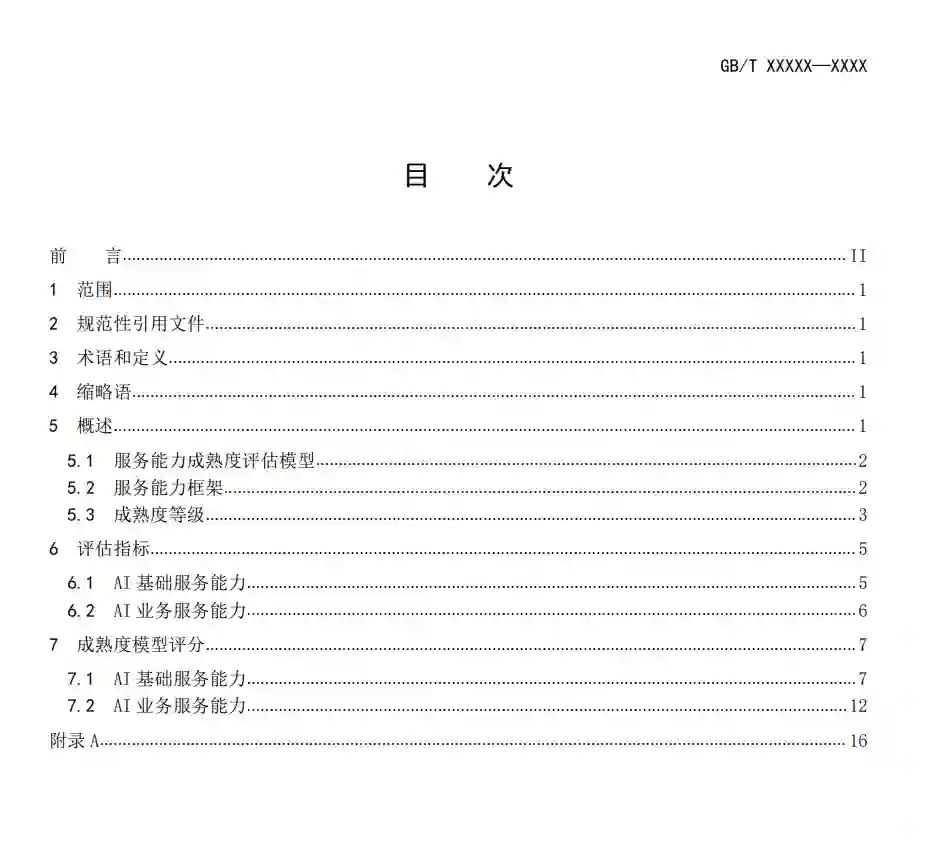 本文件提出了人工智能服务能力成熟度评估模型,规定了成熟度等级、能力框架、评估指标和评估方法。 本文件适用于对服务提供商提供的人工智能服务能力的成熟度评估,以及服务能力成熟度模型中某项能力主域、能力子域的单项评估