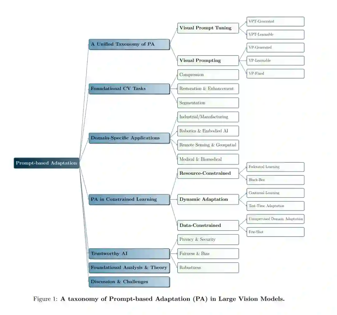 在计算机视觉领域,视觉提示(Visual Prompting, VP)与视觉提示微调(Visual Prompt Tuning, VPT)近年来作为轻量且高效的替代方案,逐渐成为在“预训练—微调(pretrain-then-finetune)”范式下适配大规模视觉模型的重要方法。然而,尽管该方向发展迅速,VP 与 VPT 的概念边界仍然模糊,两者在当前研究中常被交替使用,反映出学界尚缺乏对其方法特征及应用范围的系统区分。 在本综述中,我们从基本原理出发,重新审视 VP 与 VPT 的设计理念,并将其统一纳入一个称为提示式适配(Prompt-based Adaptation, PA)的框架中。我们提出了一套系统的分类方法,将现有研究划分为可学习提示(learnable prompts)、生成式提示(generative prompts)和不可学习提示(non-learnable prompts)三大类,并进一步依据注入粒度(injection granularity)区分为像素级(pixel-level)与标记级(token-level)两种方式。 除核心方法外,我们还系统回顾了 PA 在多个领域的融合与扩展,包括医学影像分析、三维点云处理、视觉-语言任务,以及其在测试时适配(test-time adaptation)与可信 AI(trustworthy AI)中的应用。同时,我们汇总了当前主要的评测基准,并探讨了该方向面临的关键挑战与未来研究趋势。据我们所知,这是首个专门聚焦于 PA 方法与应用的系统性综述,旨在为研究者与从业者提供一条清晰的路线图,以全面理解并探索提示式适配研究的最新进展与未来方向。 有关提示式适配方法的完整汇总,请参阅资源库: 👉 https://github.com/yunbeizhang/Awesome-Visual-Prompt-Tuning