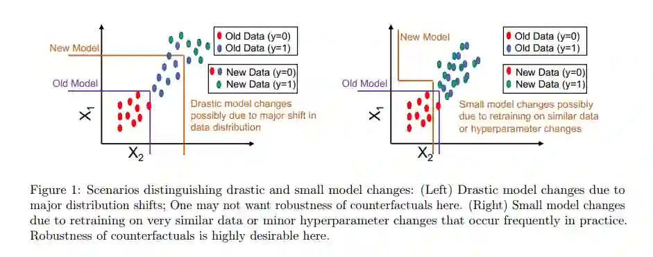 反事实的解释提供了从机器学习模型中获得预期结果的方法。然而,这样的解释对于基础模型中的某些真实世界的变化(例如,重新训练模型,改变超参数,等等)并不是鲁棒的,在几个应用中质疑它们的可靠性,例如,信贷。在这项工作中,我们提出了一种新的策略——我们称之为RobX——来为基于树的集成生成鲁棒的反事实,例如XGBoost。基于树的集成在鲁棒的反事实生成中带来了额外的挑战,例如,它们具有非光滑和不可微的目标函数,并且在非常相似的数据上进行再训练时,它们可以在参数空间中发生很大的变化。我们首先引入了一种新的度量——我们称之为反事实稳定性——它试图量化反事实对再训练下的模型变化的稳健性,并带来理想的理论属性。我们提出的策略RobX适用于任何反事实生成方法(基础方法),并通过使用我们的度量反事实稳定性迭代改进基础方法生成的反事实来搜索鲁棒的反事实。我们在基准数据集上比较了RobX与流行的反事实生成方法(基于树的集成)的性能。结果表明,我们的策略生成的反事实比现有的最先进的方法更鲁棒(在实际模型更改后,其有效性接近100%),而且也更现实(就局部异常因素而言)。