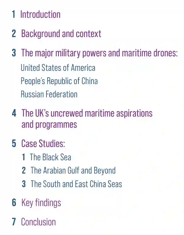 本研究回顾了世界主要军事强国发展海上无人机(在海洋上、海洋下或海洋上空作业的无人机)的情况,尤其详细介绍了英国发展海上无人机能力的努力。重要的是,它还研究了三个具体案例(黑海、阿拉伯湾、南海和东海),在这些海域,海上无人机已经部署,并在海军力量投射中发挥着重要作用。