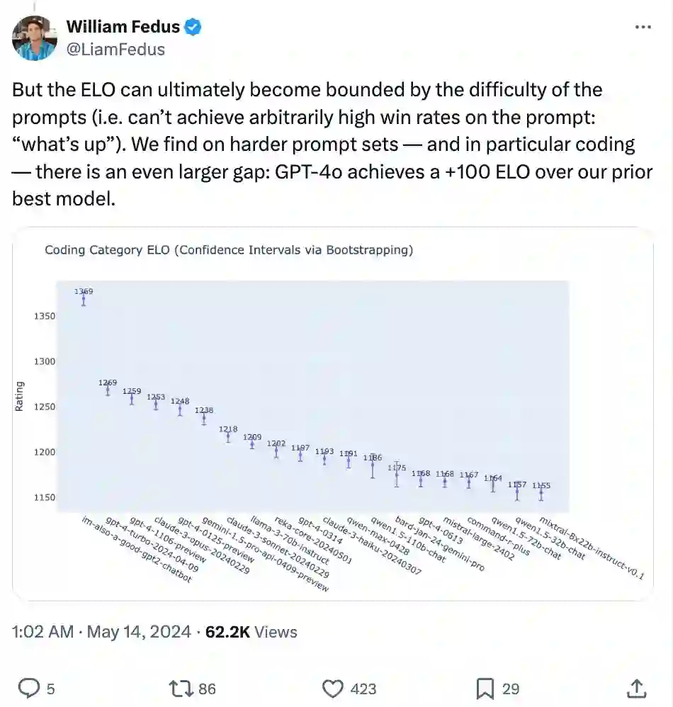 在比较困难的 prompt 集上 —— 特别是编码方面:GPT-4o 相比于 OpenAI 之前的最佳模型,性能提升幅度尤其显著。