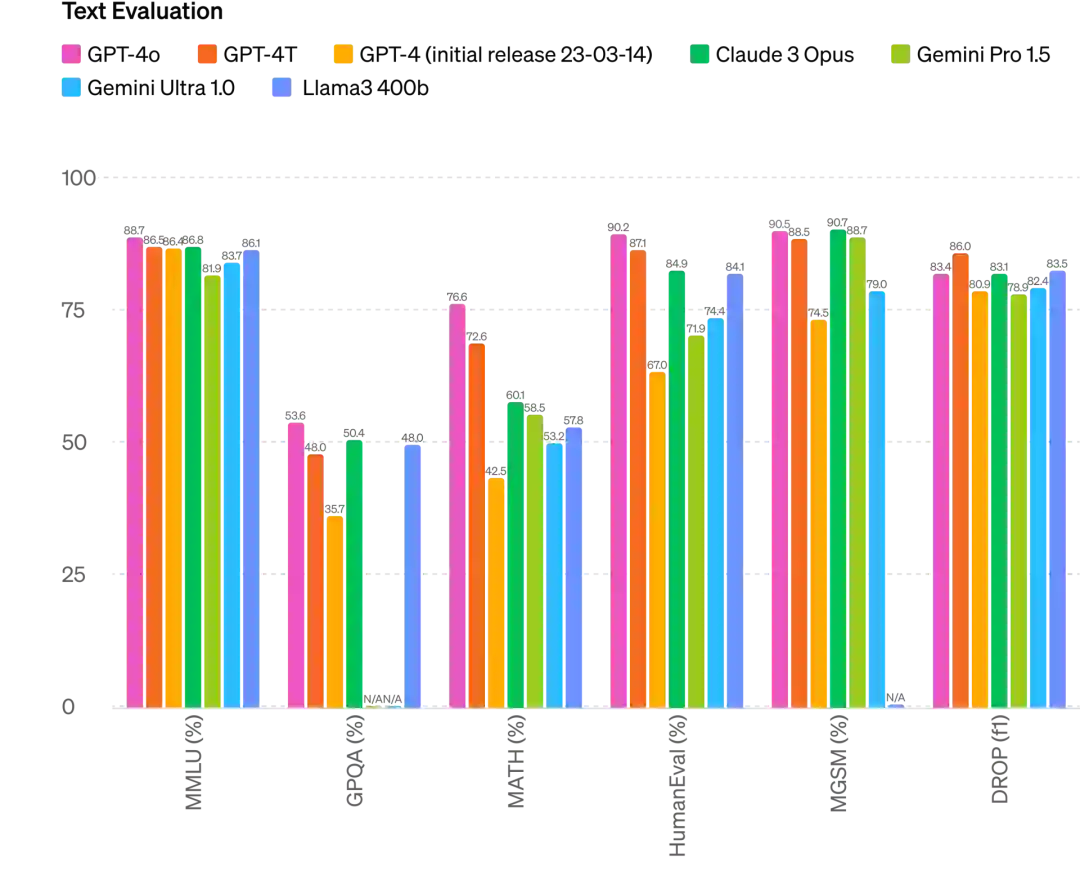 推理提升:GPT-4o 在 5-shot MMLU(常识问题)上创下了 87.2% 的新高分。(注:Llama3 400b 还在训练中)