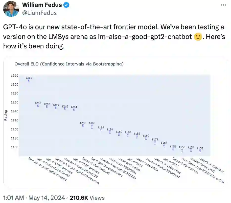 OpenAI 技术团队成员在 X 上表示,之前在 LMSYS Chatbot Arena 上引起广泛热议的神秘模型「im-also-a-good-gpt2-chatbot」就是 GPT-4o 的一个版本。
