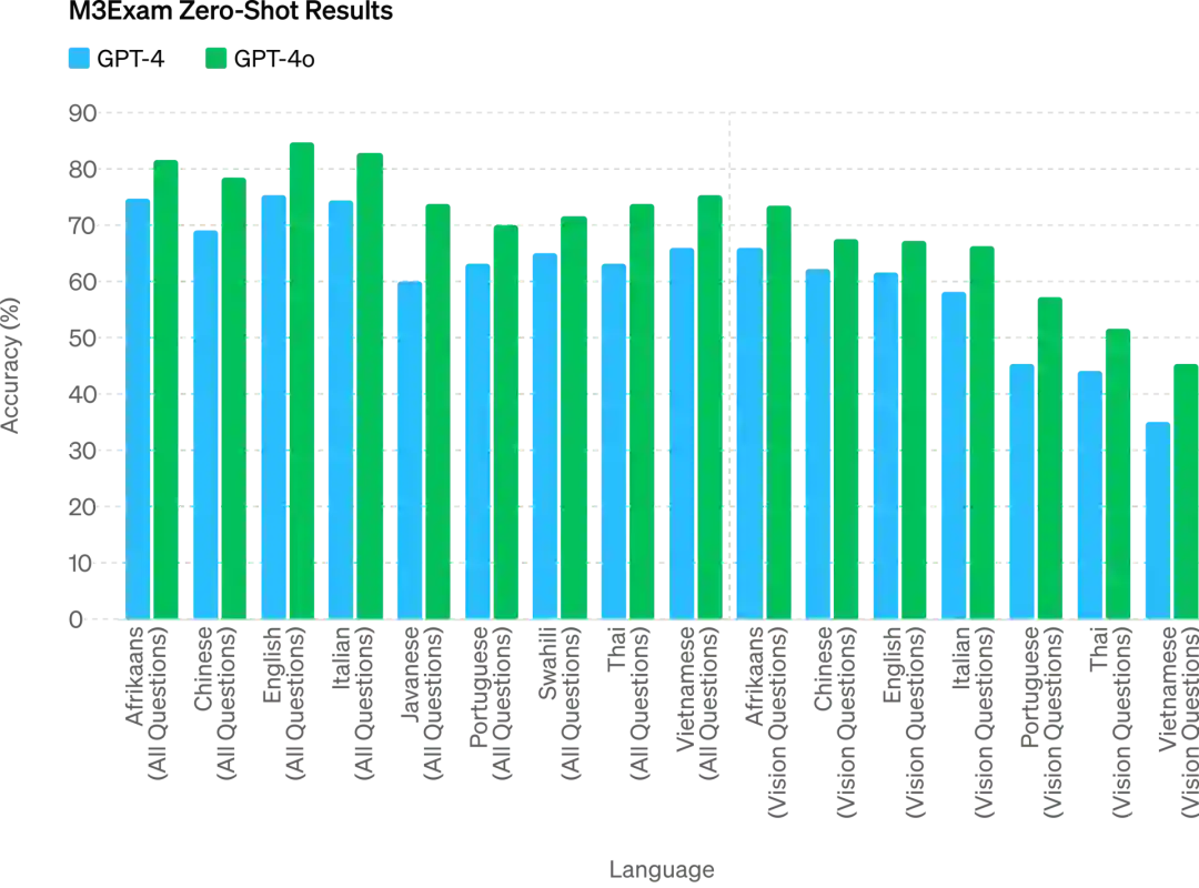 M3Exam 基准测试既是多语言评估基准也是视觉评估基准,由来自多个国家 / 地区的标准化测试多项选择题组成,并包括图形、图表。在所有语言基准测试中,GPT-4o 都比 GPT-4 更强。