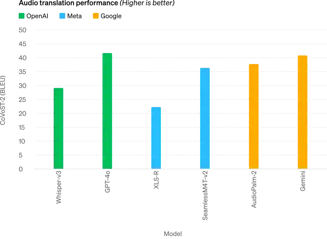 GPT-4o 在语音翻译方面取得了新的 SOTA 水平,并且在 MLS 基准测试中优于 Whisper-v3。
