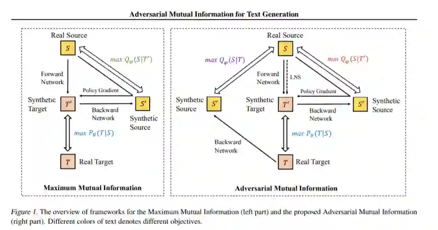 在最大化源与目标之间的互信息方面的最新进展已经证明了它在文本生成方面的有效性。然而,以往的工作对MI(即MI)的后向网络建模关注较少。这对于变分信息最大化下界的紧密性至关重要。在本文中,我们提出了一个对抗互信息(AMI):一个文本生成框架,它是一个新的鞍点(min-max)优化,旨在识别源与目标之间的联合交互。在这个框架中,通过比较真实和合成的数据分布,前向网络和后向网络能够迭代地提升或降级彼此生成的实例。我们还开发了一个潜在噪声采样策略,利用高级语义空间的随机变化来增强生成过程中的长期依赖性。基于不同文本生成任务的大量实验表明,所提出的AMI框架能够显著优于多个强基线,我们还表明,AMI有可能为变分信息最大化问题带来更紧密的互信息上限。