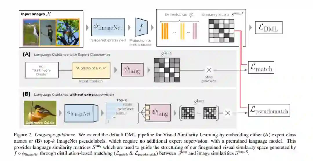 深度度量学习(Deep Metric Learning, DML)提出学习度量空间,将语义相似性编码为嵌入空间距离。这些空间应该可以转移到训练期间看到的类别之外。通常,DML方法使用任务网络来解决在二元类分配上定义的对比排序任务。然而,这种方法忽略了实际类之间的高级语义关系。这导致学习后的嵌入空间编码不完整的语义上下文,并歪曲类之间的语义关系,影响了学习后的度量空间的泛化性。为了解决这一问题**,我们提出了一种视觉相似度学习的语言指导目标**。利用专家类名和伪类名的语言嵌入,我们根据有意义的语言语义对视觉表示空间进行上下文化和重新对齐,以获得更好的语义一致性。大量的实验和消融为我们提出的方法提供了强大的动力,并显示语言指导为DML提供了显著的、模型无关的改进,在所有基准上实现了具有竞争力的和最先进的结果。代码可在https://github.com/ExplainableML/LanguageGuidance_for_DML获得。