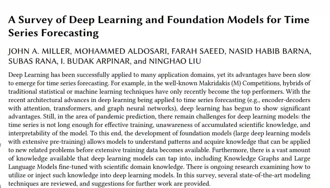 深度学习已经成功应用于许多应用领域,但其在时间序列预测方面的优势显现较慢。例如,在著名的 Makridakis(M)竞赛中,传统统计或机器学习技术的混合应用直到最近才开始表现突出。随着深度学习的最新架构进展(例如,带有注意力机制的编码器-解码器、变换器和图神经网络)被应用于时间序列预测,深度学习开始展现显著优势。然而,在大流行病预测领域,深度学习模型仍面临挑战:时间序列长度不足以进行有效训练、对累积的科学知识缺乏认识、以及模型的可解释性问题。为此,基础模型(具有广泛预训练的大型深度学习模型)的开发使得模型能够理解模式和获得知识,这些知识可以在广泛训练数据变得可用之前应用于新的相关问题。此外,深度学习模型还可以利用包括知识图谱和用科学领域知识微调的大型语言模型等大量知识。目前,正在研究如何将这些知识利用或注入到深度学习模型中。在这篇综述中,我们回顾了几种最新的建模技术,并提出了进一步工作的建议。1 引言