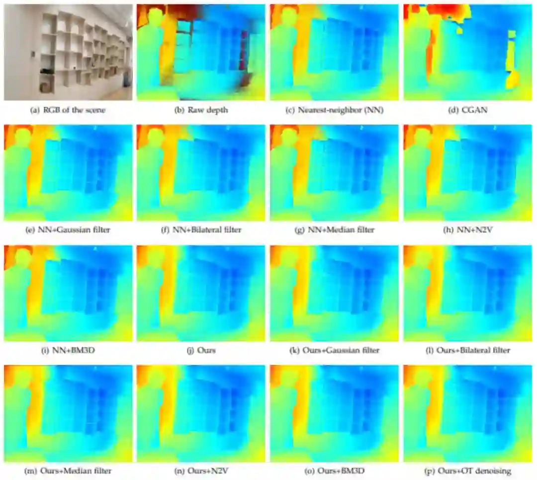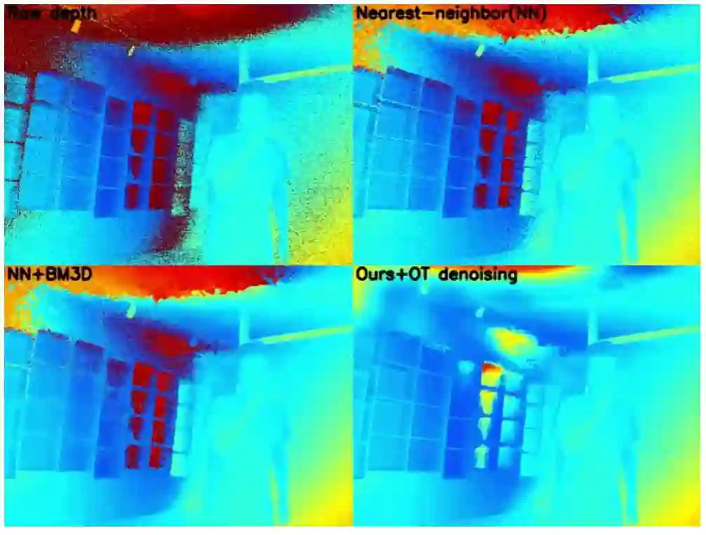 最近,深度相机变得越来越流行,而由于成像机理的不同,深度图像的噪声比RGB图像大得多。此外,由于场景中对象的反射率和透明度较低,深度图像中通常存在空洞(无效像素)。该实验中使用了一台ToF深度相机采集了1430张原始深度图像作为训练和测试集,并使用仿真的SUNCG数据集作为参考的干净图像。图7展示了重建结果的视觉比较,所提出方法可以取得最佳的去噪结果。