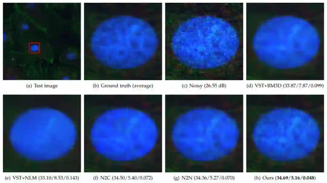 显微镜图像是生物学和医学研究的重要数据来源,然而,由于采集过程中的照明和设备等因素,显微镜图像不可避免地会受到噪声的破坏,从而影响后续的高精度分析。此外,由于没有干净的参考图像,因此需要无监督或自监督的方法。该测试中使用了真实荧光镜图像数据集FMD进行训练和测试。其中使用平均的方法获取近似的Ground Truth。表3展示了真实显微镜图像上的定量比较,所提出方法获得了最高的PSNR、最佳PI和LPIPS分数,如图6所示,所提出方法可以获得比其他方法更清晰的重建结果,这表明了其更好的感知质量。