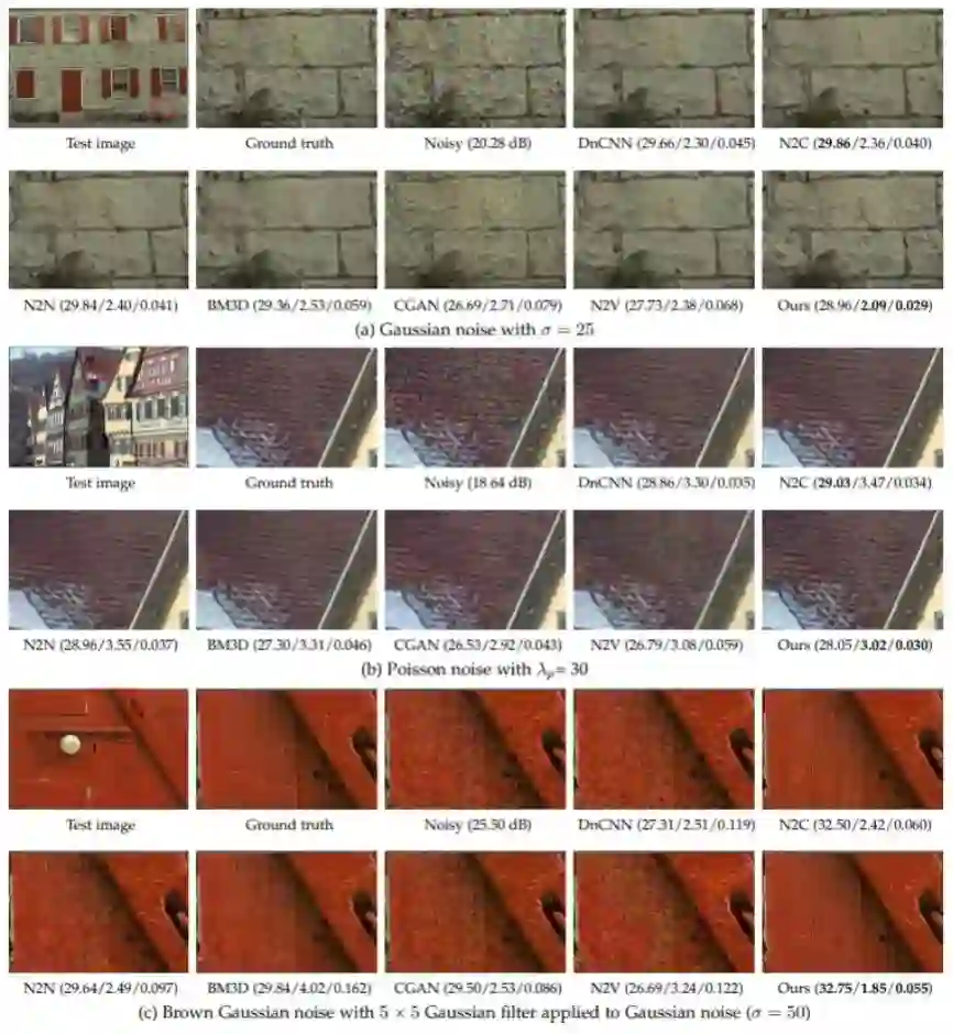首先是仿真噪声去除实验,所测试的合成噪声类型包括加性高斯噪声、泊松噪声和布朗高斯噪声,其中布朗高斯噪声是使用一个核大小为5*5的高斯滤波器过滤标准差为50的高斯噪声得到的。使用了BSDS500作为训练数据集,KODAK24作为测试数据集,表1和表2分别为失真度量和感知质量测试结果,对于空间独立的高斯噪声和泊松噪声,所提出方法比监督学习方法PSNR低1dB左右,而在空间相关的布朗高斯噪声中,所提出方法取得了最佳的PSNR,此外在所有噪声中,所提出方法均获得了最佳的PI/LPIPS分数,这表明其可以得到最佳的感知质量。如图5所示,所提出方法比DnCNN、N2C、N2N、N2V和BM3D具有更好的感知质量,因为它保留了更多的细节信息。