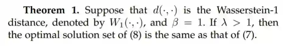 虽然进行了松弛,本文证明了:当 为 Wasserstein-1 距离,且 时,问题 和 有相同的最优解,具体定理如下: