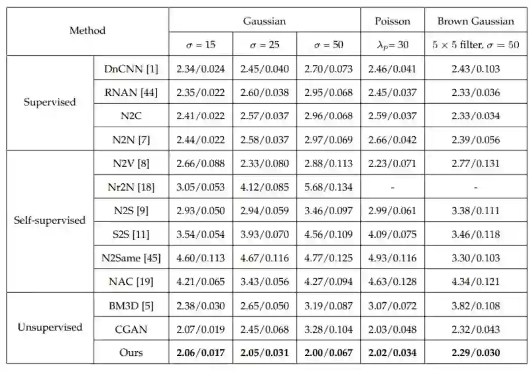 本节中使用WGAN-gp对所提出准则进行实现,其中生成器结构如图3所示,鉴别器结构如图4所示。其中生成器主体结构为U-Net架构,它由编码器中的两个下采样CNN层和解码器中的两个上采样CNN层组成。残差通道注意力模块(RCAB)被用于每个下采样和上采样层来增强网络的生成能力。我们在仿真RGB图像、仿真深度图像、真实显微镜图像、真实手机摄影图像、真实深度图像和真实原始深度图像上均进行了实验测试,并与当前最佳的一些监督学习、自监督和无监督学习方法进行了对比,此处因篇幅限制仅挑选部分进行展示,具体内容可参考原论文。 测试中使用了PSNR和SSIM作为失真度量指标,Perception Index (PI)和Learned Perceptual Image Patch Similarity (LPIPS)作为感知质量指标。