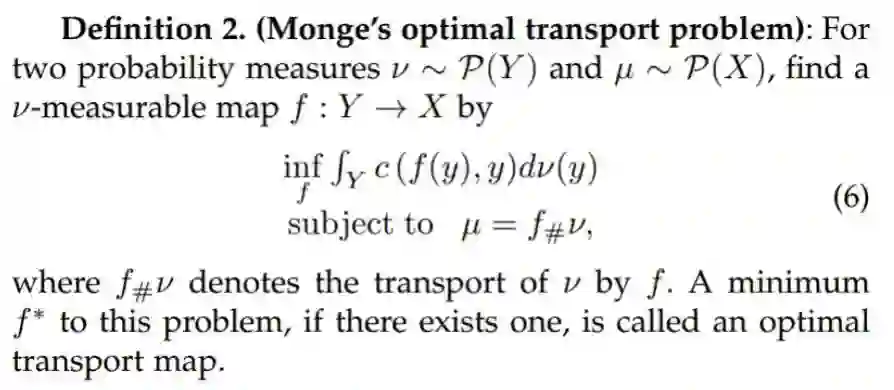 最优传输问题旨在找到将一种质量分布转换为另一种质量分布的最有效传输映射,同时最小化传输成本,其在信号处理、图像处理和机器学习中有着广泛的应用。 假设 和 是 和 上的两组概率测度,设 是一个代价函数,衡量将 传输到 的代价。最优传输问题的目标就是寻找将 传输到 代价最小的传输映射。 其中传输映射(transport map)的定义如下: