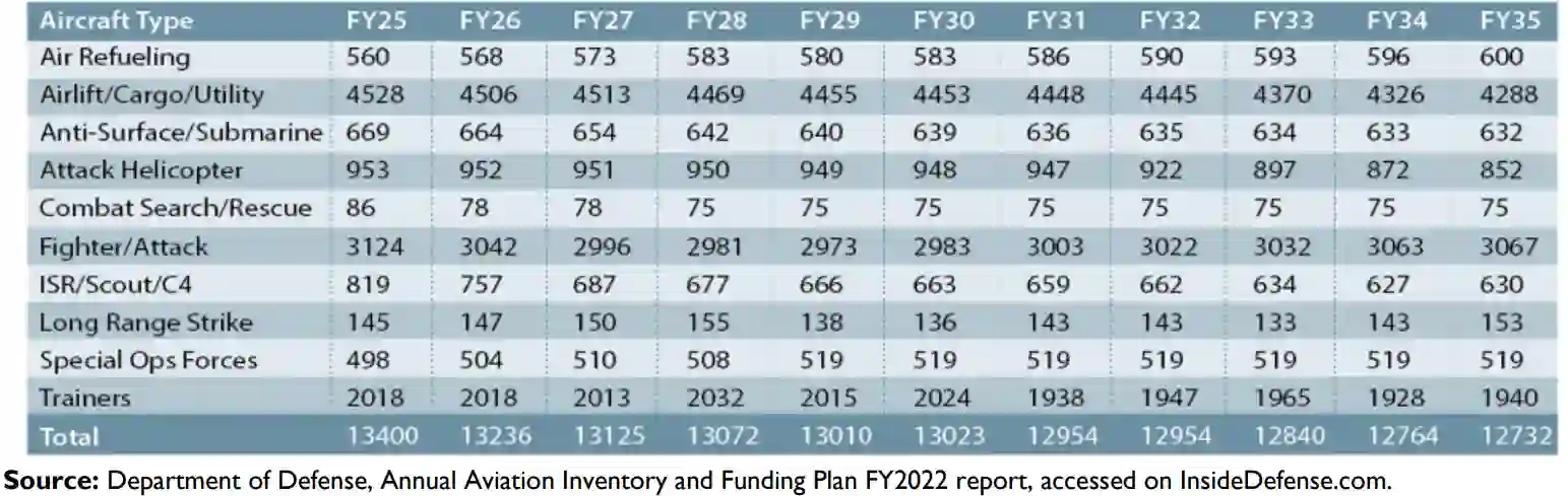 表 1. 2025 财年至 2035 财年国防部各军种年度航空库存预测数