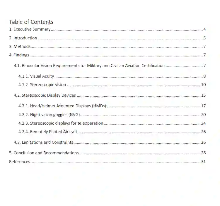 本报告研究了立体显示技术对用户的视觉要求。首先,我们回顾了民用和军用飞行员的相关视觉需求,然后讨论了以下每个显示技术子领域施加的潜在需求:头/头盔显示器(HMDs),夜视镜(NVDs),用于远程操作和遥控驾驶飞机的立体显示器。