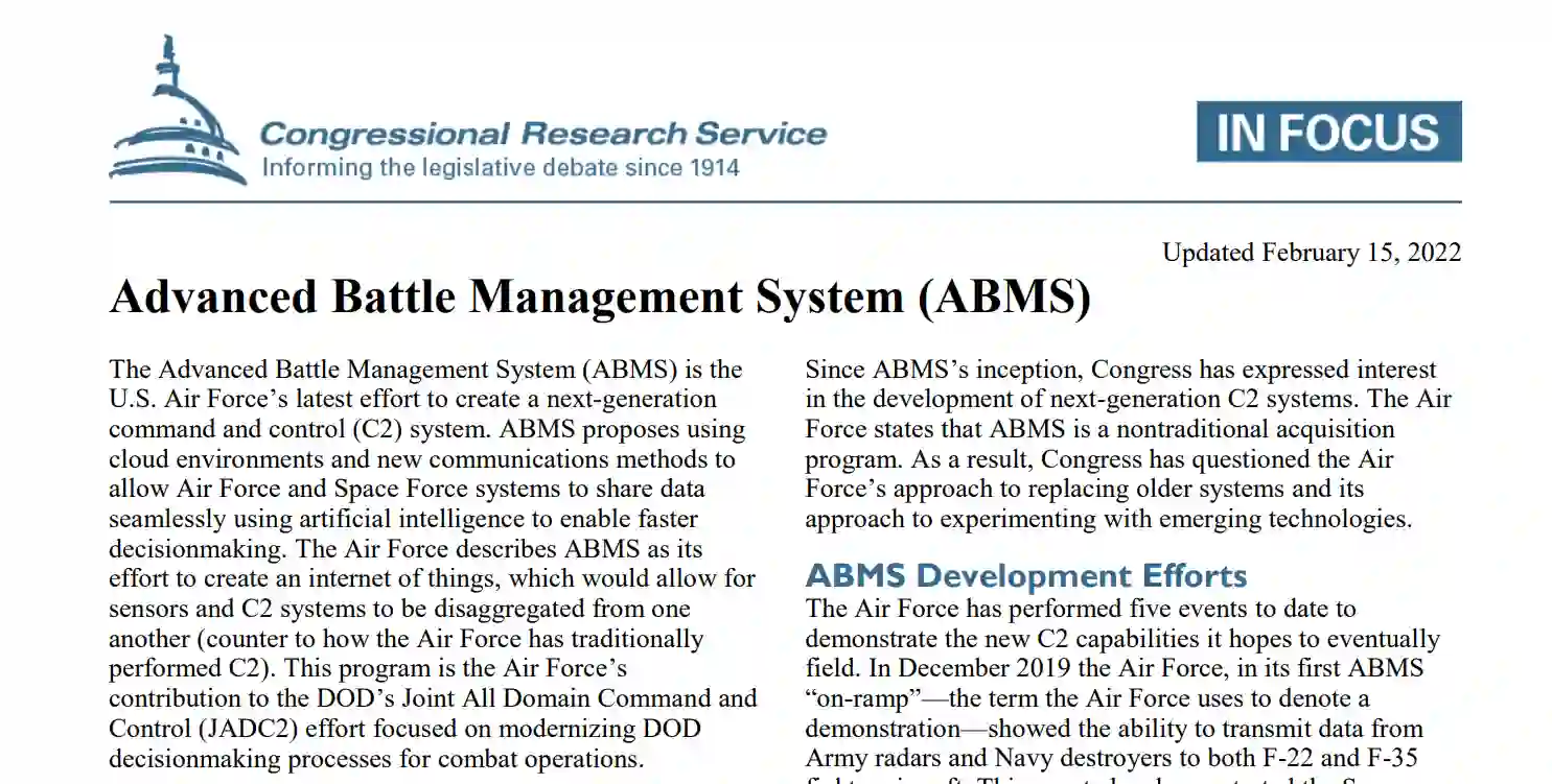 先进作战管理系统(ABMS)是美国空军创建下一代指挥和控制(C2)系统的最新计划项目。ABMS建议使用云环境和新的通信方法,使空军和太空部队系统能够使用人工智能无缝共享数据,以实现更快的决策。空军将ABMS描述为其创建物联网的努力,这将使传感器和C2系统相互分解(与空军传统上执行C2的方式相反)。该计划是空军对国防部全域联合指挥与控制(JADC2)工作的贡献,重点是使国防部的作战决策过程现代化。