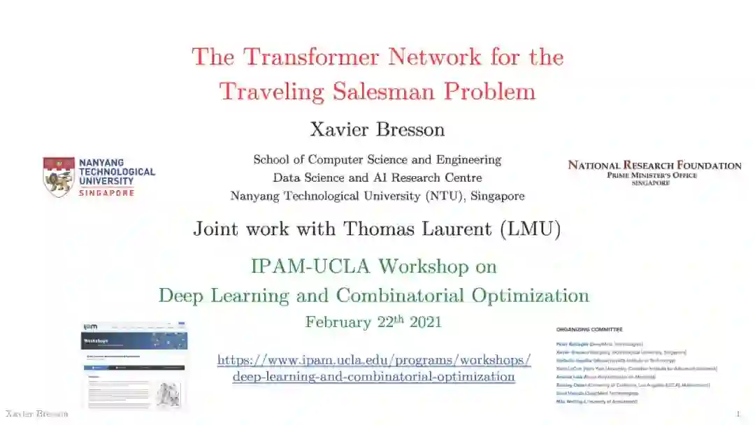 在这项工作中,我们提出将最近成功开发的用于自然语言处理的Transformer架构应用于组合TSP。训练是通过强化学习完成的,因此没有TSP训练解决方案,解码使用波束搜索。我们报告了与最近学习的启发式相比性能的改进,TSP50的最佳差距为0.004%,TSP100为0.50%。