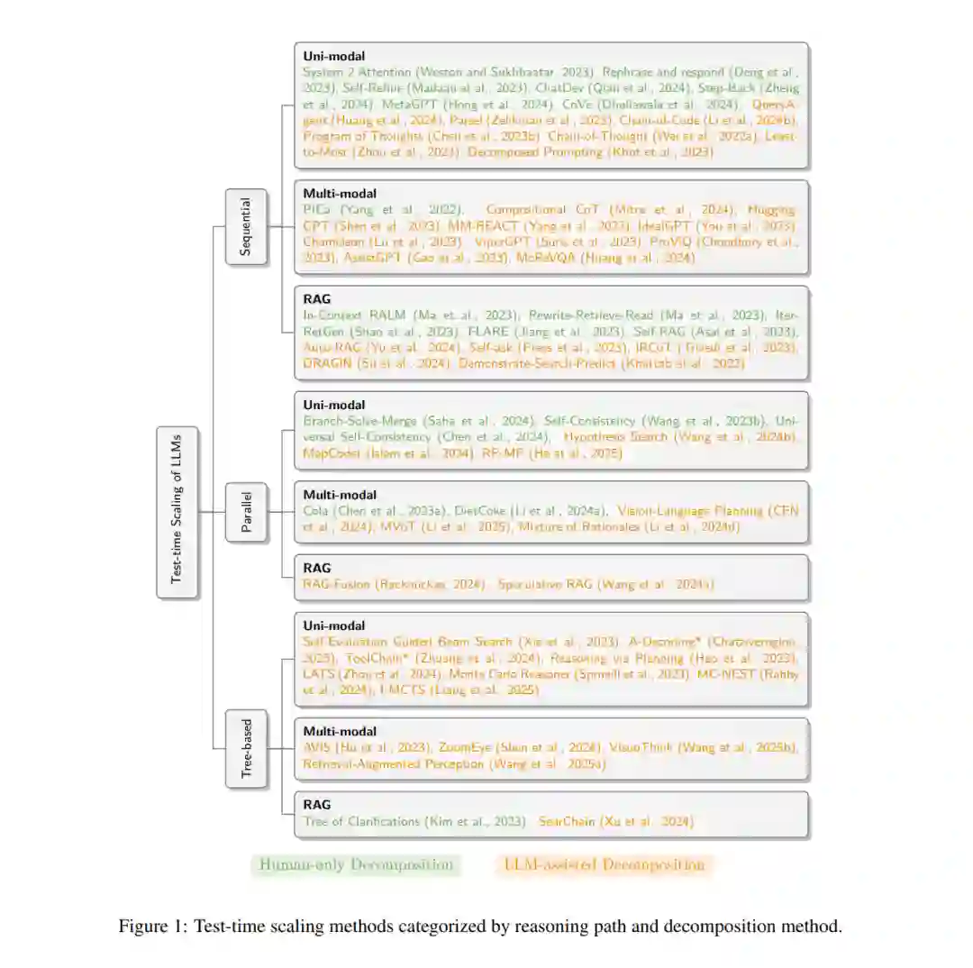 测试时扩展(Test-time Scaling, TTS)指的是在推理阶段以更多计算资源换取更高预测准确率的策略(Brown et al., 2024; OpenAI, 2024; Wu et al., 2024; DeepSeek-AI et al., 2025)。通过在推理时间投入额外计算以提升精度,测试时扩展能够在不改变模型参数的前提下,提升大语言模型(LLMs)和视觉语言模型(VLMs)的性能,并已在诸如 ARC-AGI(Chollet, 2019)等复杂任务上展现出性能提升。 测试时扩展最经典的例子无疑是 Chain-of-Thought(CoT)技术(Wei et al., 2022a)。该方法在预测最终答案之前,会顺序生成一系列描述思考过程的中间文本 token。已有研究表明,这些中间 token 能够扩展具有固定层数的 Transformer 网络可解决的问题范围(Li et al., 2024d)。 除了 CoT 的顺序式执行方式外,也可以用不同方式组织子任务或子问题。本综述论文的核心观点是:子问题结构对于性能至关重要。这一原则在理论计算机科学中早已广为人知(Cormen et al., 2001),并体现在分治法、动态规划等技术中。例如,Branch–Solve–Merge(Saha et al., 2024)和 A-Decoding*(Chatziveroglou, 2025)等方法会以并行或树搜索的方式求解子问题。 在本文中,我们从子问题结构的视角系统综述测试时扩展技术。我们提出的一个关键洞察是:子问题的识别与组织方式在不同问题域(单模态 vs. 多模态)或不同类型的大语言模型(直接生成 vs. 检索增强¹)中具有共通影响。为展示这一点,我们在不同问题域和模型家族中对相关技术进行梳理,并讨论它们的共同优缺点,以期为未来研究提供启发。 有必要明确本综述的范围。我们仅讨论不改变主 LLM 参数的方法,但不排除对小型辅助 LLM 进行微调的方法,例如在树搜索中学习启发式函数(第 3.3 节)。我们专注于以计算换精度的方法,而不讨论加速推理的方法。需要强调的是,本综述主要关注子任务/子问题结构,而非面向具体领域的技术(例如检索增强生成 RAG 中的检索技术)。 此外,将 TTS 与若干相关领域区分开来也很重要。TTS 可用于提升 LLM/VLM 的推理能力或智能体型 LLM 的能力,但这些领域还包含其他与 TTS 不同的技术。例如,推理能力可以通过训练时技术(如强化学习,DeepSeek-AI et al., 2025)提升;而智能体型 LLM 涉及诸如社会模拟(Park et al., 2023)等主题。 我们的主要贡献如下:第一,我们从子任务结构的视角,对 TTS 技术进行了详细综述,强调子任务分解在 TTS 设计中的核心地位。第二,我们对不同分解策略的相对优势与劣势进行了深入讨论,为研究者与实践者设计合适的 TTS 方法提供参考。