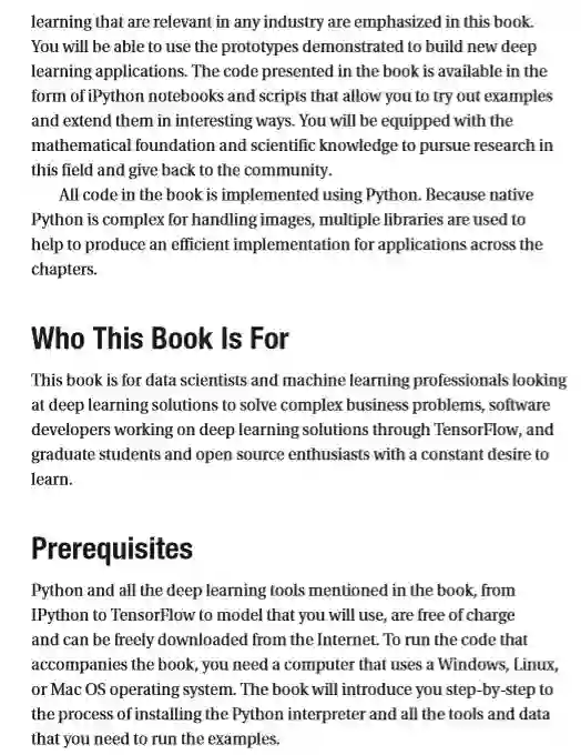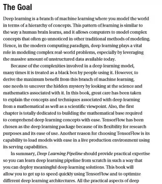 通过学习本书将了解pipline是什么以及如何工作,以便可以轻松快速地构建完整的应用程序。然后解决并克服Tensorflow的基本障碍,轻松创建功能应用程序并部署训练有素的模型。本书分步并举例可帮助读者了解深度学习流程的每个步骤,同时将最直接,最有效的工具应用于演示性问题和数据集。