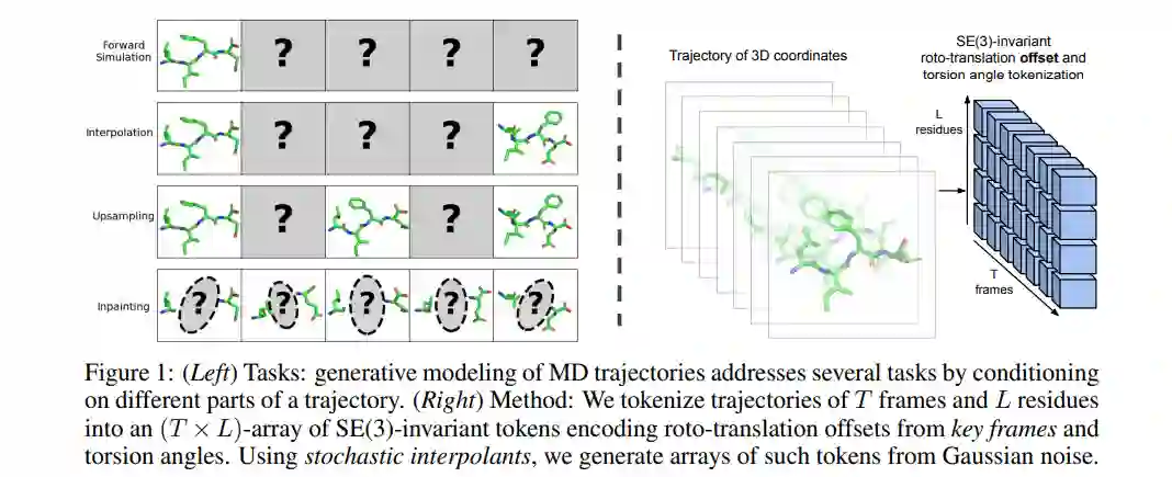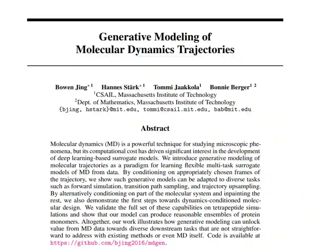 分子动力学(MD)是一种研究微观现象的强大技术,但其高昂的计算成本引发了对基于深度学习的替代模型的广泛兴趣。我们提出了分子轨迹生成建模这一范式,用于从数据中学习灵活的多任务MD替代模型。通过对轨迹中适当选择的帧进行条件化,我们展示了这些生成模型可以适应多种任务,如前向模拟、转移路径采样和轨迹上采样。通过对分子系统的一部分进行条件化并补全其余部分,我们还展示了朝着动态条件下的分子设计迈出的第一步。我们在四肽模拟上验证了这些能力的完整集合,并展示了我们的模型能够生成合理的蛋白质单体集合。总之,我们的工作展示了生成建模如何从MD数据中解锁价值,应用于各种现有方法甚至MD本身难以解决的下游任务。代码已发布在 https://github.com/bjing2016/mdgen。