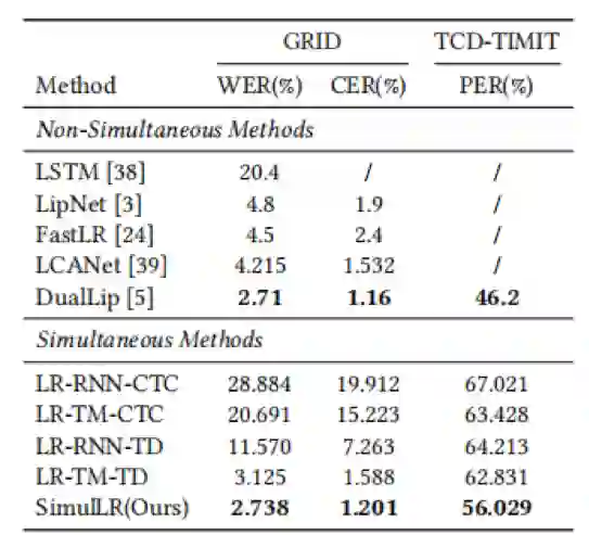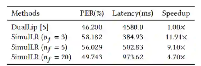 实验结果表明,与目前最先进的非同步方法相比,在每段帧数为5的情况下,SimulLR的识别速度提高了9.10倍,并取得了具有竞争力的结果,表明了本文方法的有效性。