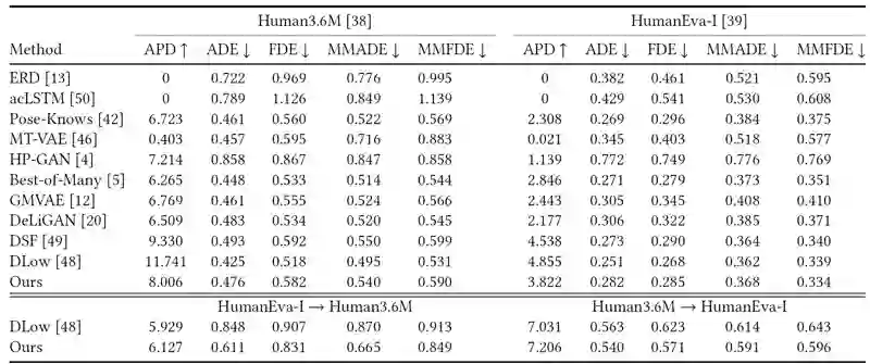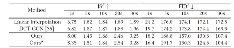 如表1和表2所示,我们在人体运动序列预测和运动序列补全两个任务上进行了实验评估。表1中显示了我们的方法在序列预测任务上达到了与当前效果最好工作相当的性能,在跨场景迁移的设定下,我们方法具有更强的泛化效果。表2中的结果显示我们方法在运动序列补全任务上的效果也要优于基线模型。