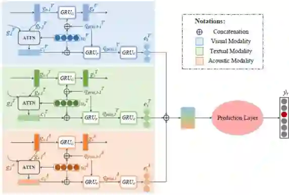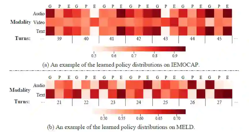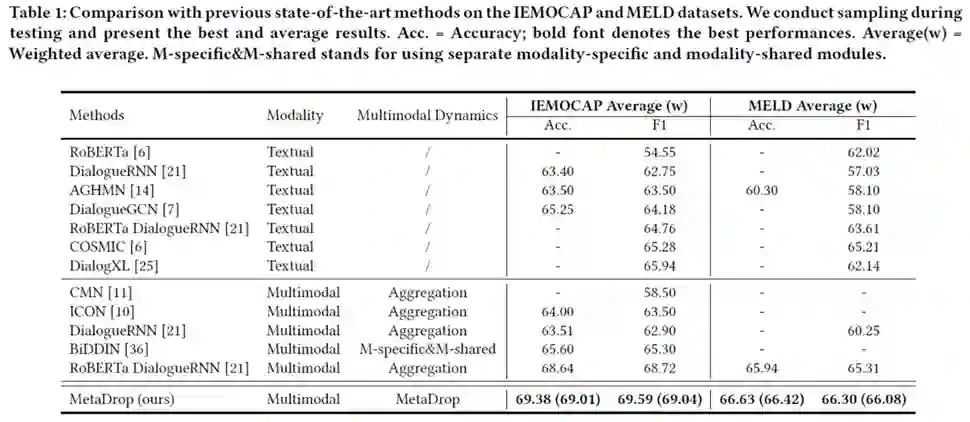 具体来说,我们为每个模态维护一个并行传播分支,其中子网络的结构相同,并且相应子模块的参数共享。每个子网络包含三个门控循环单元 (GRU),分别用于捕获上下文关系、说话者状态和情感动态(如图2所示)。在此基础上,应用了一种自适应策略确定哪些子模块(即GRU)在哪些模态中被保留或丢弃。另外我们制定了两个额外的损失函数来捕捉这种平衡。所有子模块的学习策略不仅可以视为模态级别的决策,还可以视为上下文级别的决策。即,每个学习到的策略值不仅决定在某个对话轮次中保留或丢弃不同模态的哪些信息,而且还决定何时在某模态的对话流中传播或遗忘哪些信息。因此,MetaDrop能够通过学习丢弃什么和何时丢弃来同时模拟多模态和上下文动态。在两个主流的多模态数据集IEMOCAP和MELD上进行的实验表明,MetaDrop的表现优于以前的方法。