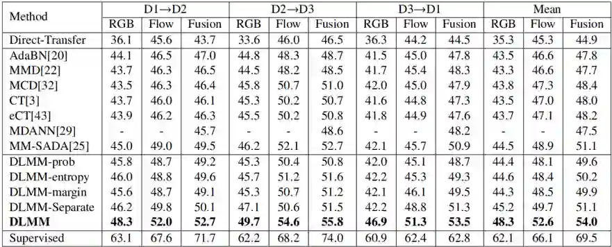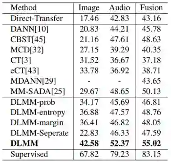 本文提出的方法DLMM在三个多模态跨域数据集上与现有的多模态域适应方法和单模态域适应方法的比较如表2、表3和表4所示,本文方法相较于其他先进方法取得了更好的跨域效果。图3展现了AVE数据集上的特征可视化效果,可以看到相比于其他方法,本文方法DLMM能够更好地减少源域和目标域的域漂移。