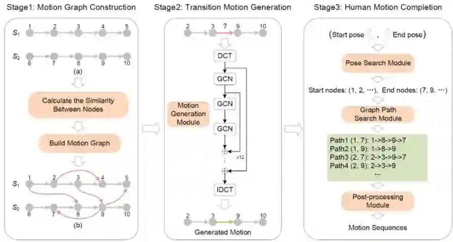 我们提出了一种基于运动图(motion graph)和生成模型的统一运动序列合成框架,可以同时用于人体运动序列的前向预测以及补全。该框架的主要结果如图1所示,主要包括三个阶段:运动图的构建、过渡序列的生成以及运动序列的预测和补全。第一阶段从训练集中构建运动图,运动图中的节点对应于人体姿态,图中的边对应于人体运动序列。边的种类包括两种:同一序列内相邻节点的连接边以及不同序列节点之间的过渡转移边。该运动图能够编码同一序列内人体的运动状态以及不同序列之间的平滑转移。第二阶段是过渡转移序列的生成,在该阶段我们使用生成模型DCT-GCN来完成运动图中过渡转移边对应的运行信息生成。第三阶段做的是运动序列的预测和补全结果生成,我们设计了一种启发式的近似搜索算法,来进行运动图中任意两个节点之间的可行路径搜索,从路径中恢复出人体运动序列的补全或预测结果。