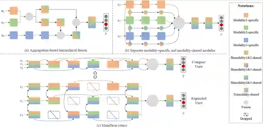 本工作寻求探索一种能以较小的成本有效适应多感官数据类型增加,同时实现充分的多模态信息交互的机制。我们提出了MetaDrop,在该框架中,模型可以自行学习以决定哪些模态里的哪些子模块由于干扰而丢弃,保留作为模态特定信息,或在跨模态中共享,且无需手动组合。如图1(c)所示,MetaDrop为每个模态中的每个子模块学习一个保留或丢弃的二元决策,自适应地选择执行或跳过哪些子模块,即决定哪些子模块被丢弃、被融合共享或被作为模态特定信息。由于学习到的策略值是离散且不可微的,我们使用了Gumbel-Softmax用于可微近似,因此可以通过标准反向传播对网络进行端到端训练。