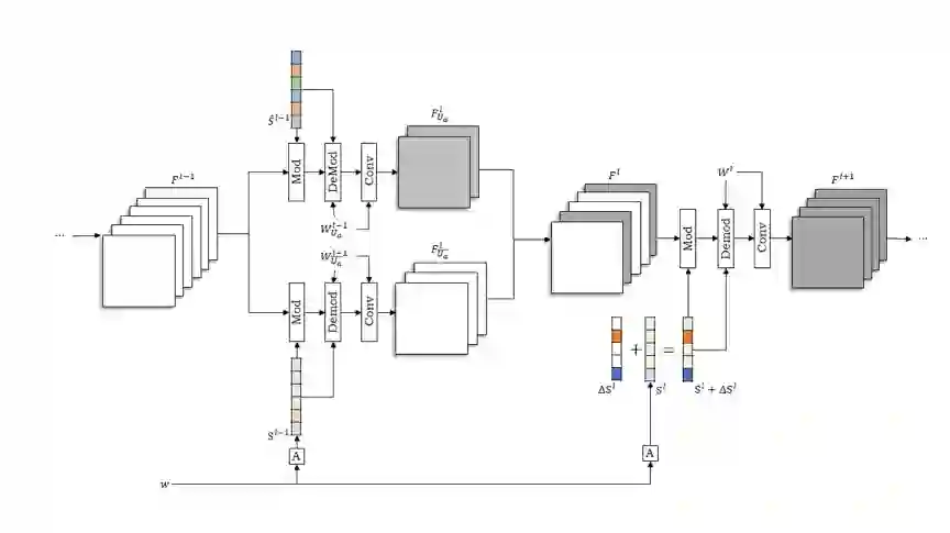 对控制单元的修改包含一个调制参数方向向量∆Sl和一个优化得到的调制参数\hat{S}^{l-1}。如图4所示,第l层卷积的输入特征的Fl一部分通道FlUa由优化得到的\hat{S}^{l-1}作为上一层调制参数调控生成;第l层卷积的调制参数则沿着稀疏的方向向量∆Sl移动。