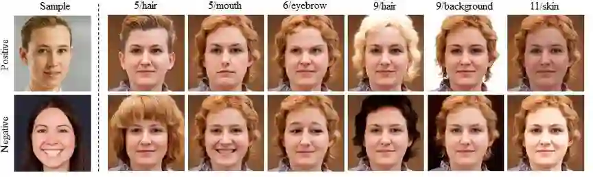 如图2所示,选择两个正负样本,计算这两个样本对应的调制参数之差,然后保留不同层的不同区域相关的调制参数之差,可以构造多个稀疏的语义编辑向量。沿着这些语义编辑向量移动调制参数,可以实现多种语义编辑效果。