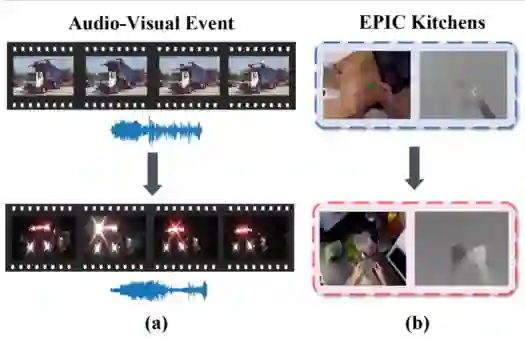 图1 多模态数据跨域场景下的域漂移示例。(a) AVE数据集的域漂移;(b) EPIC Kitchens数据集的域漂移。