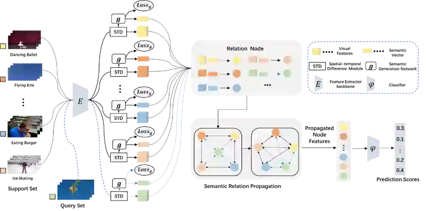 图1展示的是语义引导的关系传播网络示意图。首先,研究者发现当训练样本较少时,仅仅利用视频中的视觉特征是不能够得到较好的分类。然而样本中不仅包含视频信息,还包含语义信息。为了能够让视觉特征更加具有判别力,该研究同时利用样本中的视觉信息和语义信息,使得视觉特征更加具有判别力。同时,单纯的依赖语义信息去增加视觉特征的判别力是不够的,该研究又提出了时空差异性模块来提升对视频的视觉特征学习能力。该模型的优势在于能够利用跨模态信息为视频描述提供指导,从而增强视觉特征的判别力;同时,时空差异性模块也提升了网络对视频特征的学习能力。时空差异性模块是一个即插即用的模块,便于在其他领域进行模块内容的扩展。