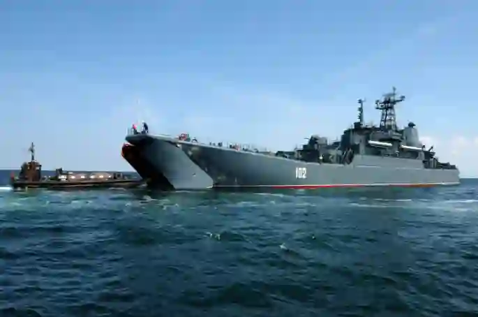 图为俄775型"蟾蜍"级登陆舰加里宁格勒号与英国登陆艇联合演练历史画面(摄于和平时期)。黑海作战表明后勤支援舰船在新技术面前异常脆弱。[英国王室版权2008]