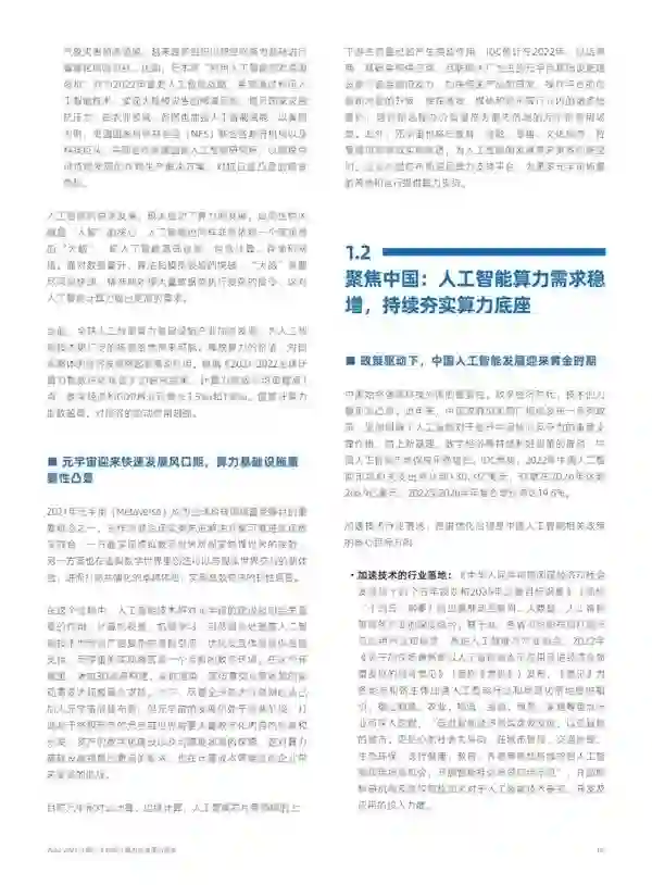 《报告》从算力层面,对人工智能芯片、服务器、 计算架构、算法及应用等方面的发展近况进行了全面分析。 从整体看AI服务器是人工智能市场增长的主力军。IDC数据显示,2021年全球人工智能服务器市场的同比增速为39.1%,超过全球整体人工智能市场增速(20.9%),是整体人工智能市场增长的推动力。中国AI服务器市场领跑全球,2021年人工智能服务器市场规模59.2亿美元,与2020年相比增长68.2%,预计到2026年,中国人工智能服务器市场将达到123.4亿美元。 从人工智能芯片角度,人工智能产业技术不断提升,产业AI化加速落地,推动全球人工智能芯片市场高速增长。IDC预计,到2025年人工智能芯片市场规模将达726亿美元。异构计算成为主流趋势,未来18个月全球人工智能服务器GPU、ASIC和FPGA的搭载率均会上升,算力多元化发展趋势明显。 从计算架构发展来看,基于 DSA( Domain-Specific Architectures)思想设计的人工智能芯片正在成为主导,推动了人工智能芯片多元化发展。多元算力从“能用”到“好用”并且为企业创造业务价值,离不开通用性强、绿色高效、安全可靠的计算系统的支持。业内正在推动多元算力系统架构创新,基于计算节点内和节点间的互联技术破局现有计算架构的瓶颈,通过充分调动起多芯片、多板卡、多节点的系统级能力,实现各种加速单元以及跨节点系统的高效协同,提升计算性能。 《报告》对于大模型的行业落地和发展情况也进行了分析。IDC调研显示,未来超过80%的组织会优先考虑购买预先训练好的人工智能模型。大模型是智算力驱动下典型的重大创新,被认为是“通用智能”的雏形,是业内探索实现普惠人工智能的重要途径之一。 大模型发展的背后是庞大的算力支撑,例如AI+Science领域的AlphaFold2、自动驾驶系统、GPT-3等模型训练需要几百甚至几千PD(PetaFlops/s-day,PD)的算力当量支持。 2022年,大模型正在成为AIGC领域发展的算法引擎,文生图、虚拟数字人等AIGC类应用将快速进入到商业化阶段,并为元宇宙内容生产带来巨大的变革。 05