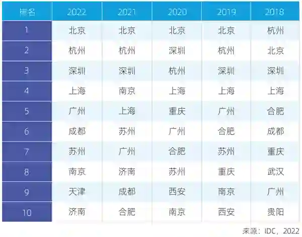 《报告》针对不同城市在人工智能投资规模、相关政策支持力度、政策落地情况和实施进展、人工智能技术成熟度,以及劳动供给等维度的情况,对中国城市人工智能发展进行综合评估。 在2022年中国人工智能城市排行榜中,北京、杭州、深圳继续保持前三名,上海和广州分列第四、五名,其中北京连续四年蝉联首位,天津首次进入前十,成都、苏州、南京、济南保持前十。 综合TOP10城市发展情况,头部城市的共性特征是,较早的政策引导和配套政策保障,充分的智算基础设施规划、投入,达到上百家AI企业集聚、十万级人才保障,千亿级AI产业集群规模。