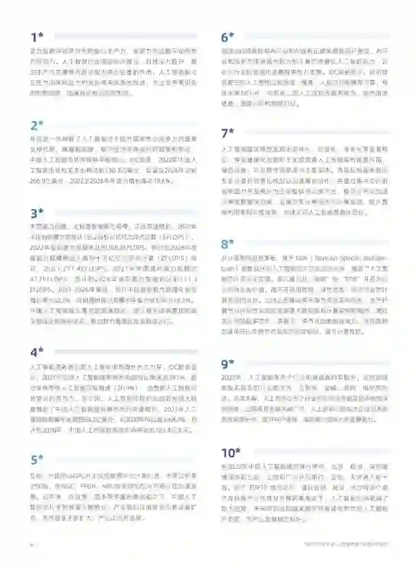 城市智能算力的投入已经成为推动区域数字经济发展,加速人工智能产业创新的重要支撑,除了TOP10城市之外,合肥、武汉、长沙等多个城市在自身产业优势及各种因素推动下,人工智能应用也取得了较大进展。 此外,一些城市深耕特定的人工智能应用并取得了明显成果,成为城市智能化新标签,如安徽宿州淮海智算中心、浙江青田元宇宙智算中心陆续投建。 03