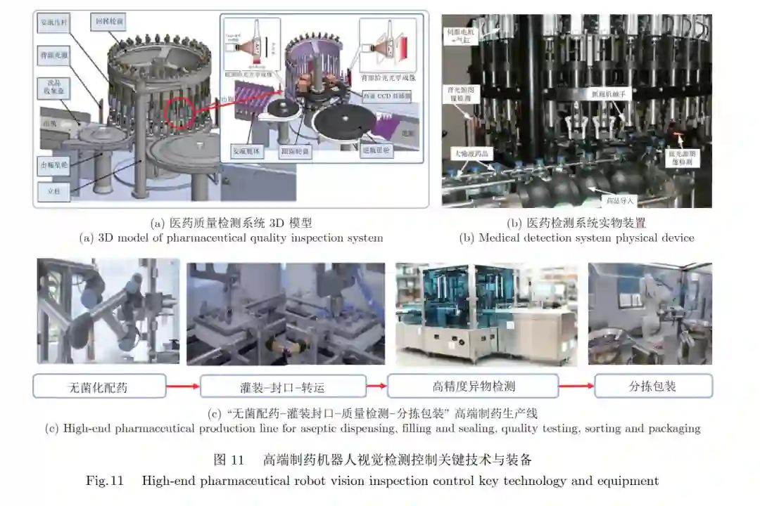 高端智能医药质量检测主要是指通过新兴的机 器人技术来代替人工进行质量检测的过程. 相比于 传统人工检测而言, 它具有稳定性好、持续工作时 间长、精度和效率高等优点. 日本 Eisai 公司、德国 Brevetti CEA 集团、意大利 Seidenader 等企业纷 纷开展机器人医药检测技术研究.我国制药装备需求量大, 医药制造装备的性能 是保证药品质量的基础. 为解决传统药品质量检测 环节依赖人工、漏检、误检频发等问题, 需研制高端 制药机器人视觉检测控制关键技术与装备, 实现制 药过程无菌化、无人化生产, 保障药品质量安全. 高 端无菌化制药机器人面临的主要挑战包括: 制药技 术装备工艺复杂, 无菌化控制难; 制药过程污染颗 粒微小、种类多、检测难; 高端制药过程中多工序、 多任务、多机器的协同控制难. 湖南大学团队针对 高端制药装备感知与控制的重大需求, 攻克高端制 药灌装封口机器人协作控制、高端制药检测机器人 视觉识别、高端制药分拣机器人视觉控制等关键技 术, 研制出无菌化配药双臂机器人、药品灌装−转运− 封口机器人、药品质量视觉检测机器人、药品分拣 机器人等自动化生产线装备, 如图 11 所示