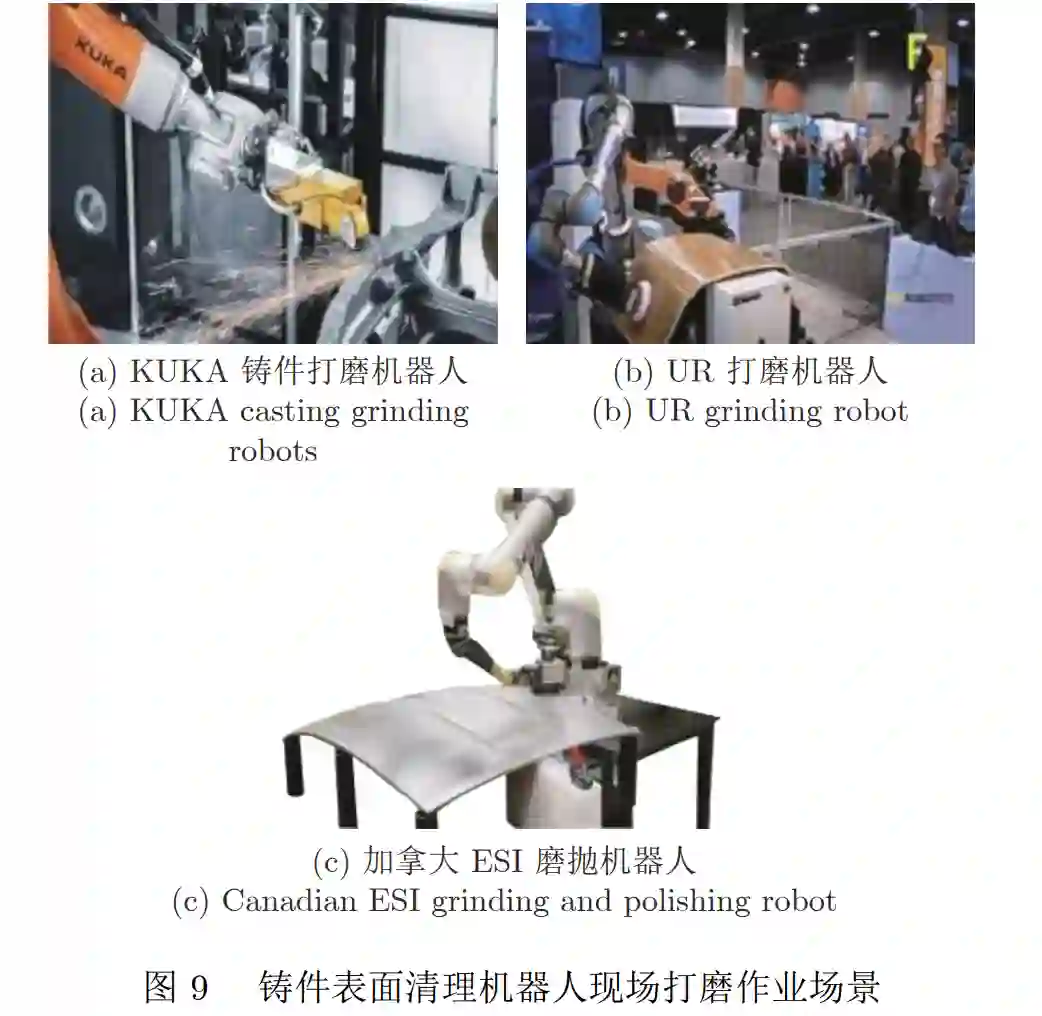 磨抛加工是表面改性技术的一种, 能够有效提 高部件表面的平整度和光洁度, 获取特定的表面粗 糙度, 消除焊接等加工过程中产生的应力, 具有柔 性灵活性强、作业效率高、加工一致性好等优点. KUKA、ABB、FANUC、YASKAWA 等机器人企 业均开展了磨抛机器人的应用研究. 如图 9(a) 所 示, KUKA 公司研制的 KR 120 R2900 Fextra 机 器人, 通过将该机器人和负荷能力为 750 kg 的三轴 式定位装置, 在不损伤工具且毛刺外形不同的情况 下, 能够确保高标准、高质量完成打磨任务. 如图 9(b) 所示, 奥地利 Fer Robotics 公司开发了基于气控系 统的浮动打磨与抛光末端系统, 实现在单一方向上 的快速浮动打磨与抛光, 浮动力控制精度最高可达 到 1 N, 用户通过快速简便的编程, 在提升质量的 同时节约更多成本. 如图 9(c) 所示, 加拿大 ESI 公 司依托自研的协作机器人, 开发了 E-Stial 柔性打 磨机器人工作站, 利用实时力控反馈、精密轨迹调 整、精密接触力调整等先进技术实现了安全、稳定、 高效的抛光打磨作业, 克服了传统磨抛方式调试时 间长、成品质量不一致等缺点. 美国 Carnegie Mellon University[133] 等科研机构从前沿理论探索的角 度对磨抛机器人进行了研究. 文献 [134−135] 设计 了磨抛机器人模糊 PID 控制方法, 采用末端位置和 关节角度参数设计模糊规则, 使 PID 控制器参数在 每次采样时在线更新, 提高了系统的响应速度和稳 态精度. 基于模糊逻辑方法[136] 和基于机器学习的方 法[137] 被用于对磨抛机器人关键模型信息进行估算, 从而减小对于模型信息的依赖. 国内的科研机构也对磨抛机器人的相关技术开 展了持续的研究, 华中科技大学陶波教授等针对大 型风电叶片加工区域大、形状复杂、任务规划难等 问题, 提出了基于几何及任务信息的大型复杂构件 加工区域划分方法[138] . Zhao 等以风电叶片表面打 磨为应用背景, 构建了大型复杂构件机器人移动打 磨硬件系统, 并在风电叶片表面打磨实验中进行了 系统性验证[139−140] .