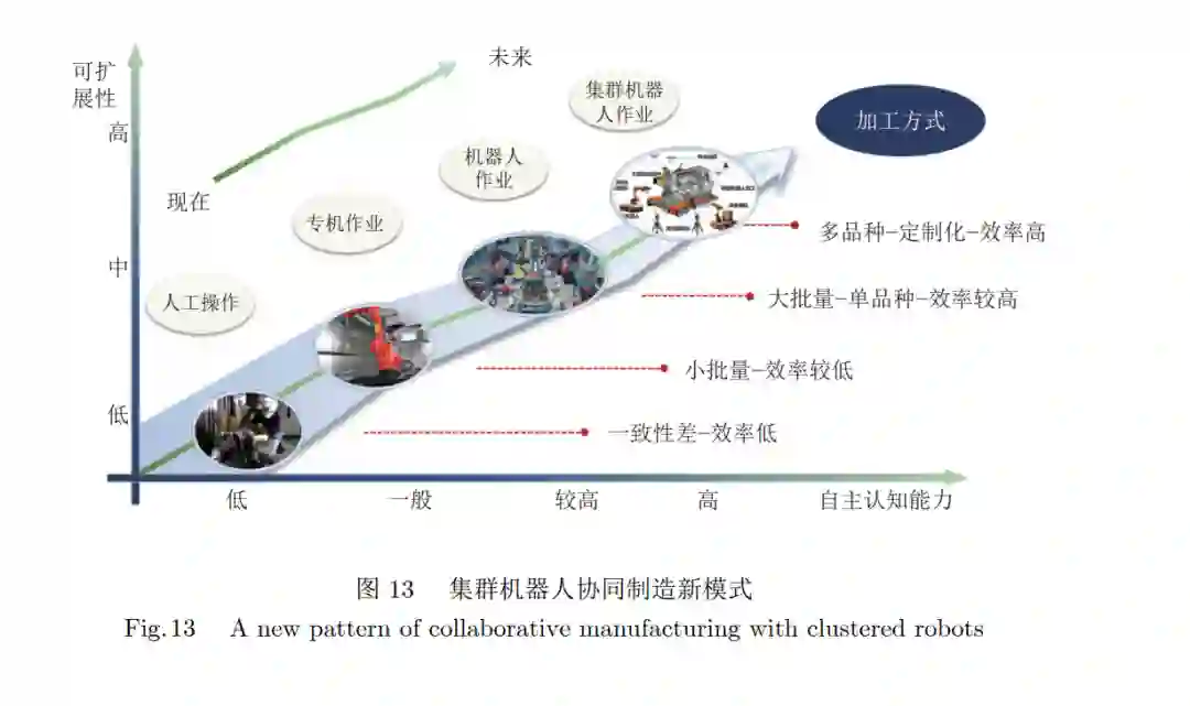 **4) 集群机器人技术. **智能制造机器人涉及先进 信息技术、机器人技术、自动化技术以及机械工程 与材料工程交叉融合等前沿制造技术. 面对大规模 的智能制造任务, 机器人往往处于分散、低连通环 境, 为适应需求多变、异构感知对象、突发问题等情 况, 需根据特定感知任务, 准确描述跨域多实体、多 机器的动态协作关系, 进而探索自适应的群组动态 协作感知与融合策略, 实现智能制造机器人的跨域 融合感知. 还需在动态和多维信息收集的基础上, 对复杂问题进行自主识别、判断、推理, 并做出实时 性的决策, 实现集群机器人的精准感知与实时规划, 集群机器人有望在新一代智能制造系统发挥重要作 用, 如图 13 所示.