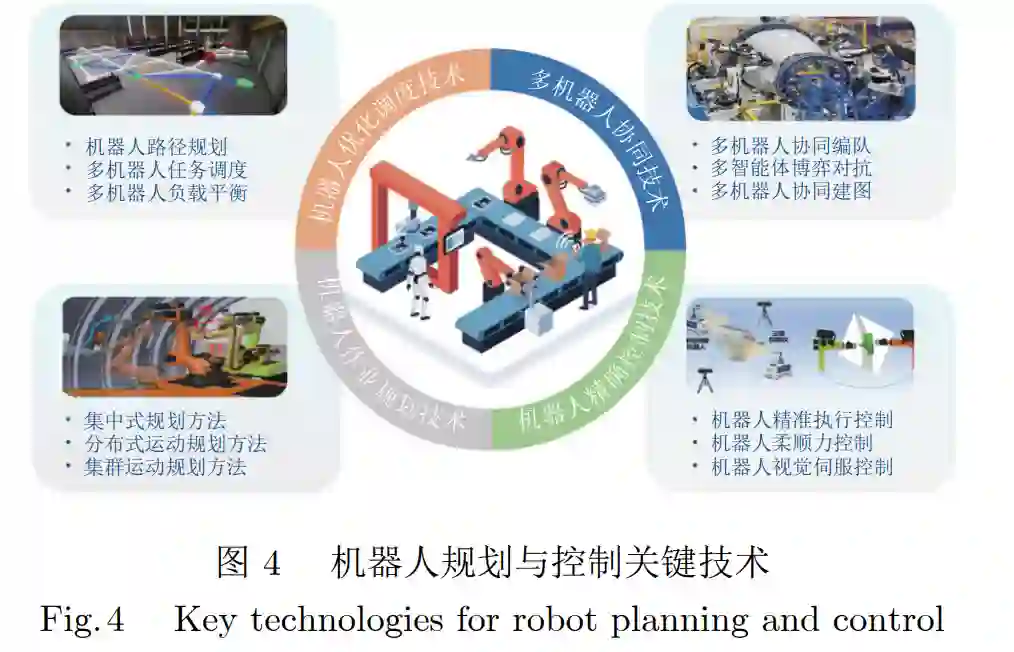 1.3 机器人控制关键技术 在智能工厂中, 机器人的控制性能不仅影响到 最终的加工效果, 还影响到加工过程的安全. 高精、 高效、高柔性、高稳定性的控制策略为工件的安全 制造提供了保障 (图 4).