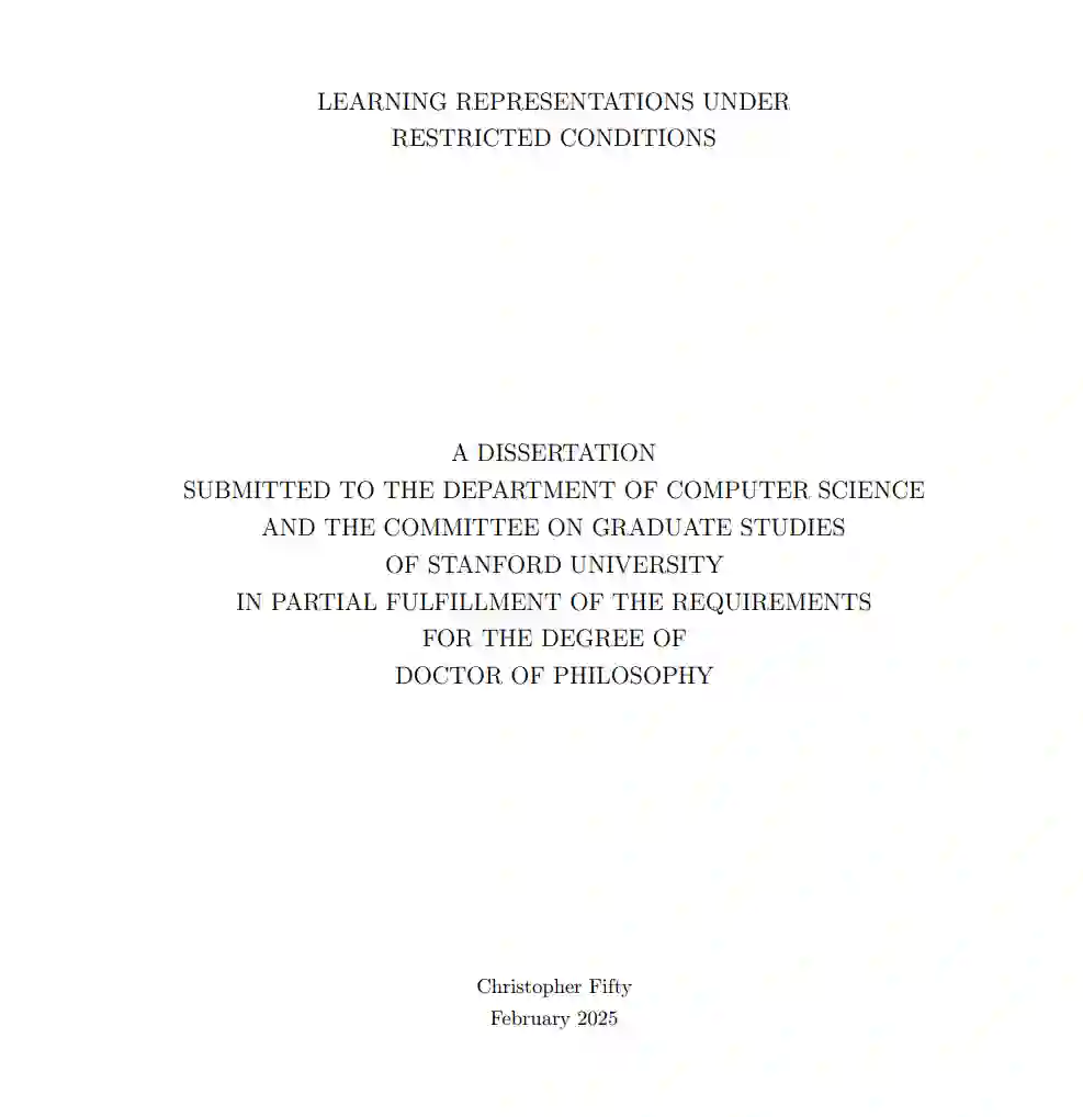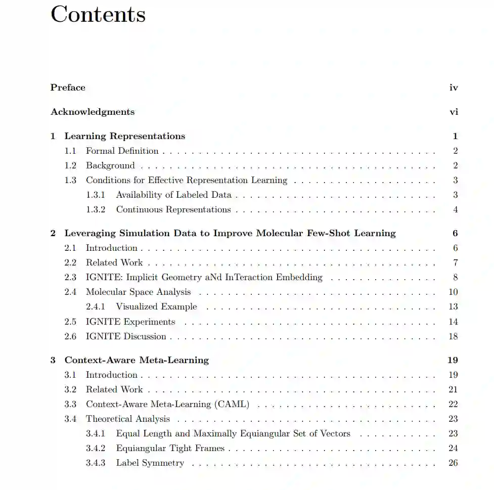受限条件下的表示学习很少有学科能像机器学习这样在过去十年中经历如此快速的发展。即使在过去的几年中,研究领域也在不断演变,并重新聚焦于新的挑战,这些挑战往往由改变社会、影响人类思维、生活和工作的潜力所驱动。支撑这些进步的核心组件是表示学习:一种将输入转换为新表示的技术,以捕捉数据中的结构和模式。本论文并不专注于改进典型学习范式中的表示学习,而是探索其在某些情况下表现不佳的实例。我们的重点是在受限条件下学习表示,并朝着在表示学习表现不稳定、性能较差或“效果不佳”的环境中解锁表示学习迈出一步。第一章从表示学习的概述开始。它提供了正式的定义,探讨了早期表示学习算法的历史,并概述了这些方法通常需要满足的两个条件。然后,我们研究了打破这些条件会如何干扰表示学习,并列举了这些限制在现实世界中的几种表现场景。第二章,我们聚焦于数据稀缺的限制,并以分子科学中的一个应用为动机展开研究。我们探索利用基于物理的分子模拟数据(借助数十年的技术进步)来学习捕捉基本蛋白质-配体结合模式的表示。对于我们的目标任务——预测小分子是否激活或抑制特定蛋白质,我们发现使用基于模拟数据训练的表示作为起点,可以显著提高建模性能。第三章继续关注数据稀缺问题,但从不同的角度解决这一问题。我们开发了一种元学习算法,该算法能够使用极少量的标注样本学习如何将输入转换为新任务的表示。与之前需要在标注样本上进行微调的工作不同,我们的方法在推理过程中不更新模型参数,并且在许多少样本学习基准测试中达到了新的最先进水平。第四章,我们转向学习离散表示的限制。这一范式具有挑战性,因为离散化在通常用于学习表示的光滑目标函数中引入了不可微分的点。我们专注于一种流行的离散化形式——向量量化,并改变了梯度通过这一操作的方式。在11种使用向量量化的不同范式中,我们的梯度估计器提高了性能并减少了训练不稳定性。第五章总结了本论文的贡献,并提出了未来工作的可能方向。