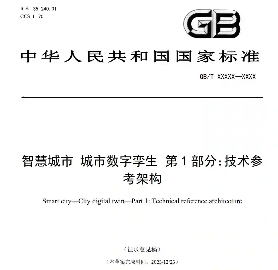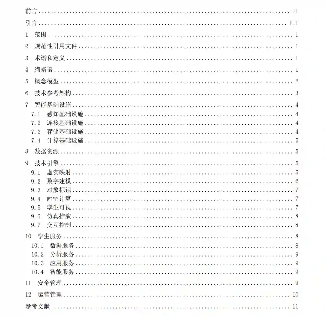 GB/T XXXXX《智慧城市 城市数字孪生》分为3部分:――第1部分:技术参考架构。目的在于确立城市数字孪生的概念模型和技术参考架构。 ――第2部分:数据参考架构。目的在于确立城市数字孪生的数据参考架构。 ――第3部分:业务参考架构。目的在于确立城市数字孪生的业务参考架构。 本标准为GB/T XXXXX《智慧城市 城市数字孪生》的第1部分。本标准规范了城市数字孪生的定义,给出了城市数字孪生的概念模型以及技术参考架构,分别对城市数字孪生系统的信息智能基础设施、城市数据、技术引擎、孪生服务、安全管理以及运营管理等维度进行规范。本标准适用于指导城市数字孪生的规划、建设、运营、服务以及数字孪生技术在城市中应用和部署。 城市数字孪生是在数字空间实现对城市物理空间和社会空间的全面映射和连接,通过对城市物理空间和社会空间所包含的城市要素实体的全域历史及实时数据的采集、汇聚、建模、分析以及反馈,完成对城市要素实体及活动的全周期可溯、动态迭代以及实时反馈,实现城市模拟、验证、预测、控制。城市数字孪生概念模型见图1。