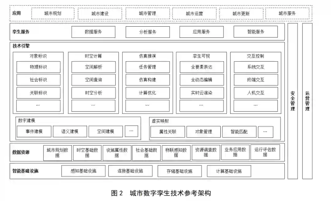 城市数字孪生以物理空间和社会空间为目标实体对象,以智能基础设施为支撑,全面融合城市各类数据,通过技术引擎构建数字实体及服务体系,贯穿于城市规划、建设、管理、运营、更新、服务等全生命周期的应用场景中。城市数字孪生技术参考架构由智能基础设施、数据资源、技术引擎、孪生服务、安全管理和运营管理等构成有机综合的系统,如图2所示。 具体描述如下: a) 智能基础设施是为城市数字孪生建设和发展提供感知、连接、存储、计算等能力的各类设备的总称; b) 数据资源是城市目标实体的形式、约束、规则等属性数据和城市各类信息化系统数据的汇聚,包括城市规划数据、时空基础数据、设施属性数据、社会基础数据、物联感知数据、资源调查数据、业务应用数据、运行评估数据等; c) 技术引擎是实现城市物理空间、社会空间向数字空间映射的主要数字孪生技术的集合,包括数字建模、虚实映射、对象标识、时空计算、仿真推演、可视化、交互控制等; d) 孪生服务是基于智能基础设施、数据资源,通过技术引擎提供的城市数字孪生通用服务的总称,包括数据服务、分析服务、应用服务、智能服务等,为城市规划、建设、管理、服务等提供决策支持; e) 安全管理是根据城市安全管理制度,开展数据安全、网络安全、安全预警和应急处理等管理工作; f) 运营管理提供设备和系统的运行、维护及运营服务,实现对城市要素、生态环境等运行状况的实时监测和统一呈现以及城市突发事件的快速响应和应急处理。